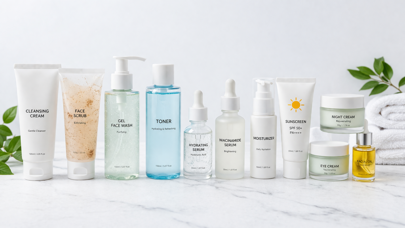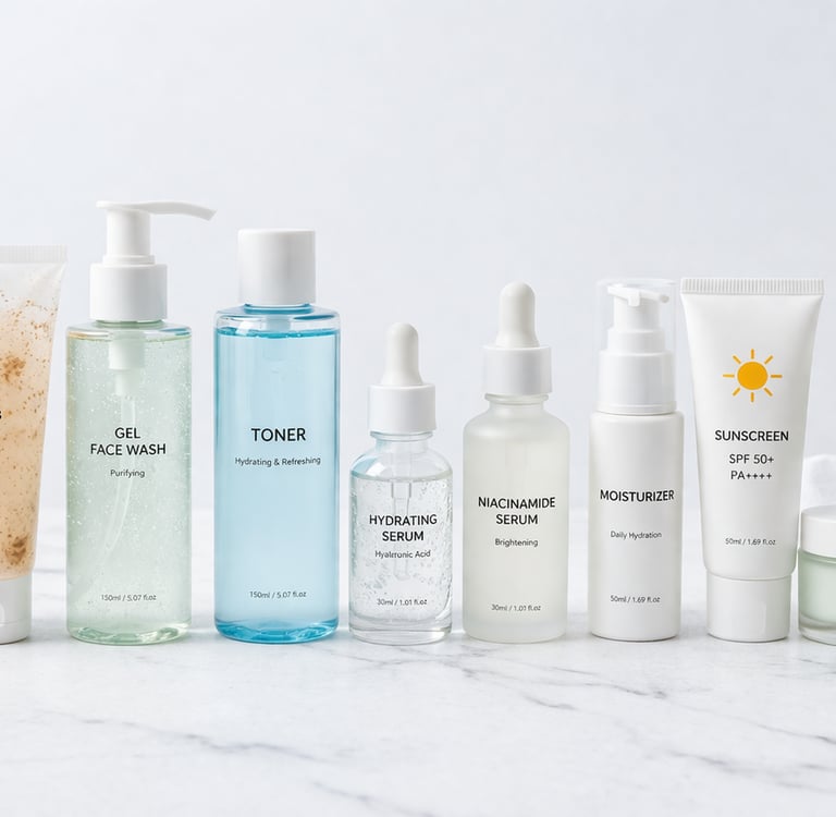 Discover the perfect skincare routine with 10 essential products including face wash, toner, serum, scrub, moisturizer, and sunscreen. Learn how to build a complete skincare routine with Glownesttt.com for clear and glowing skin.